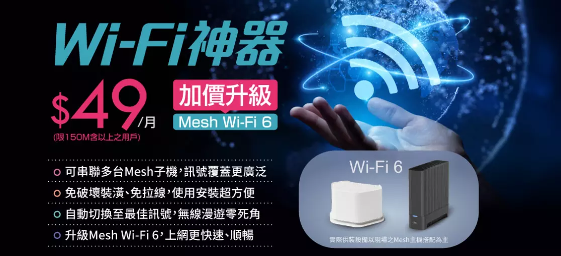 立即申辦「Wi-Fi神器 全戶皆通」方案, 享受專業安裝、Mesh Wi-Fi 6免費升級與全屋暢通新體驗。